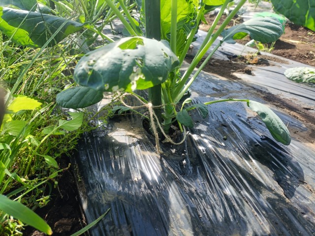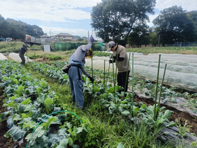 芽キャベツのネットを剥がして支柱建て