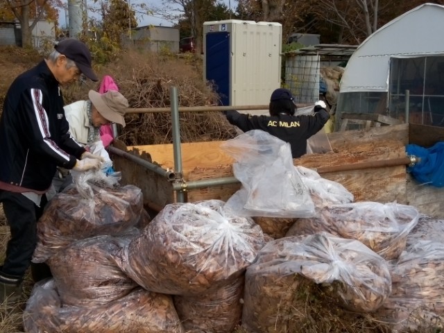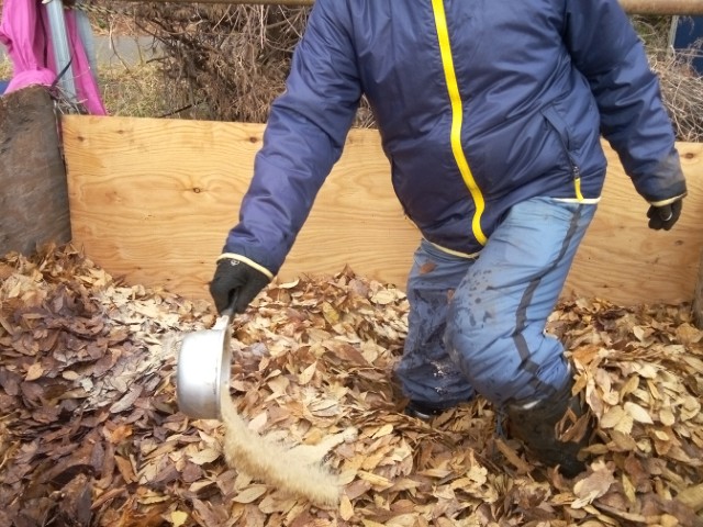 落ち葉堆肥づくりの様子です。落ち葉を入れ、米ぬかを入れ、水をまき、あとは踏み踏みします。