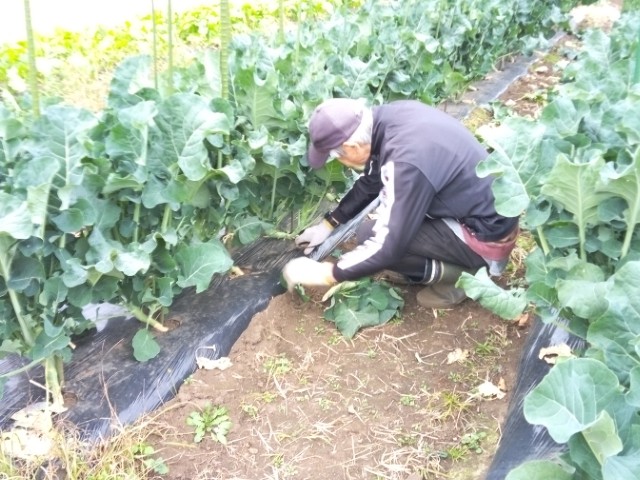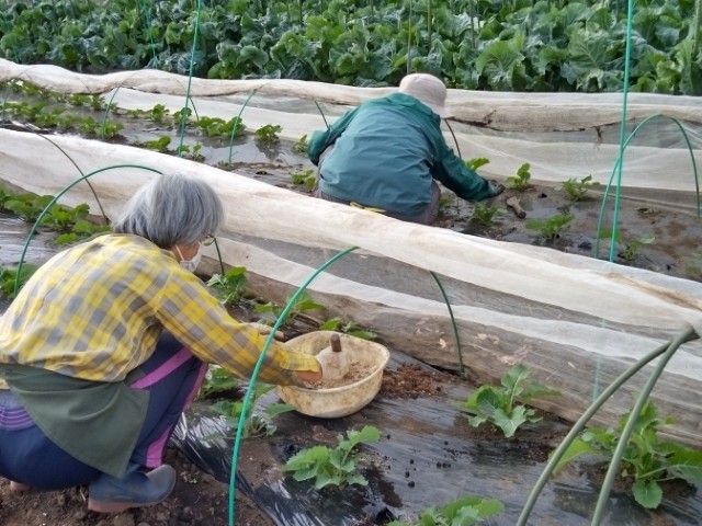 ノラボウナに追肥します。春先に何度でも収穫できる便利な野菜です。