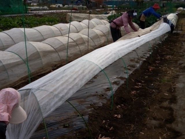 ネットの下に不織布を張ります。うまくネット内の温度調整ができますように。