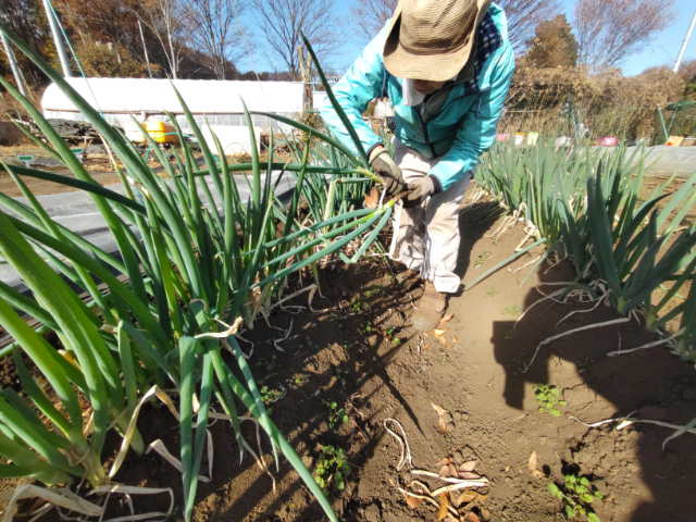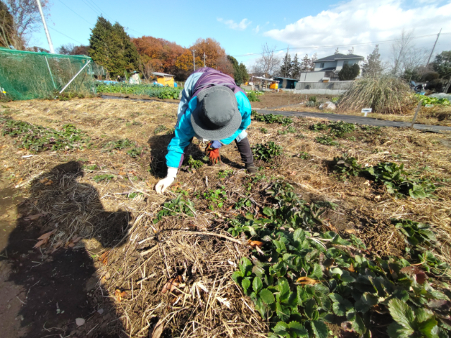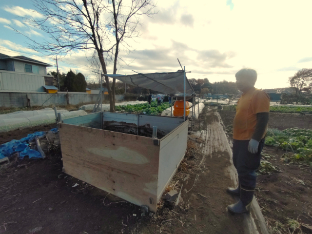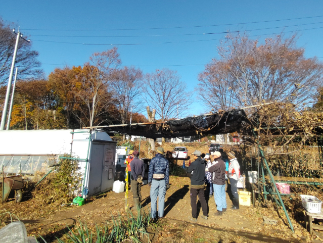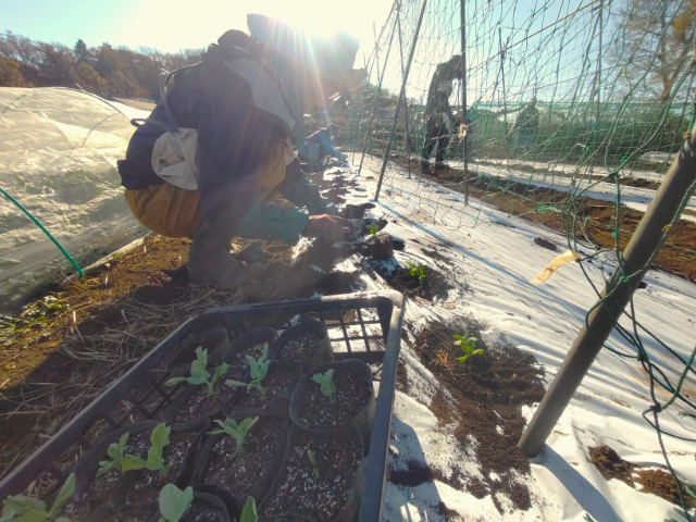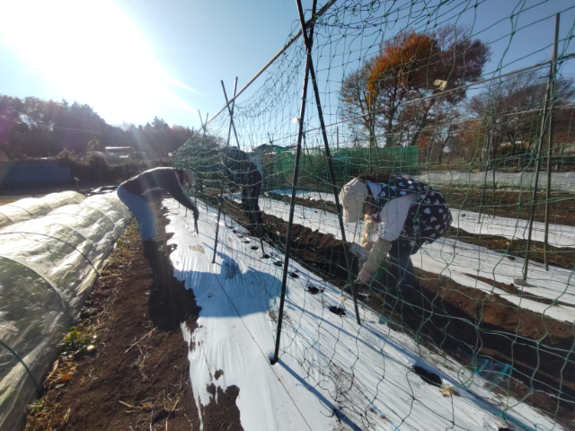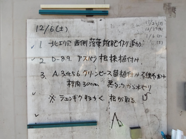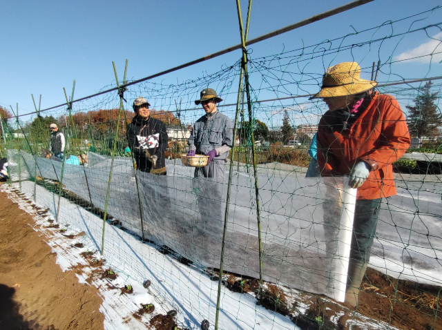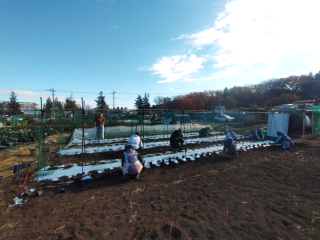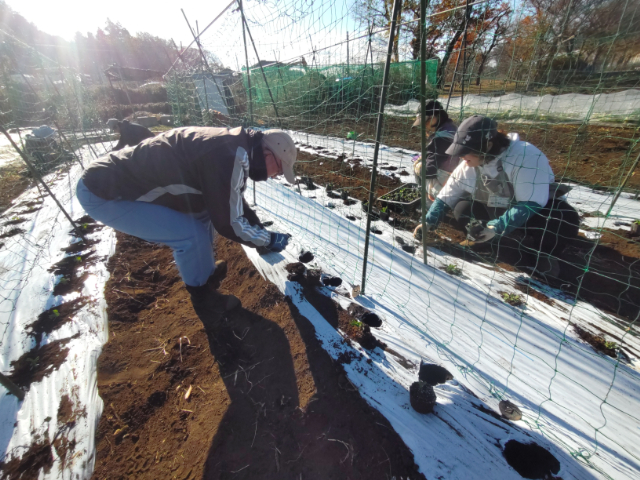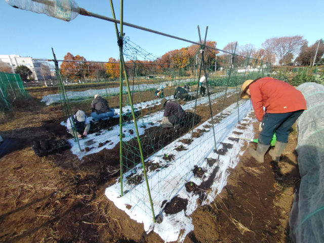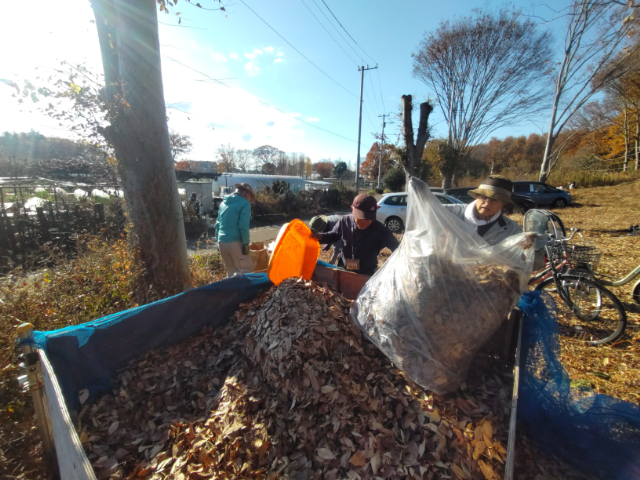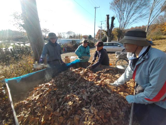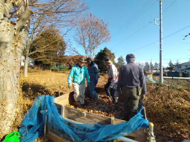 今日の作業は、落ち葉堆肥づくり、グリーンピースの苗の植付けなど。