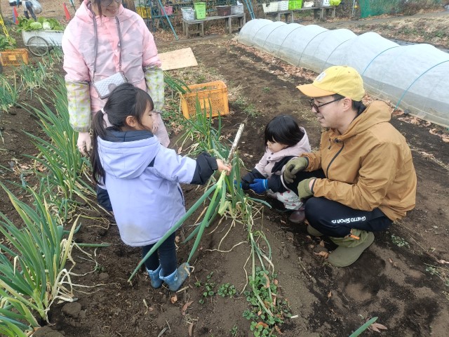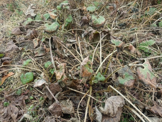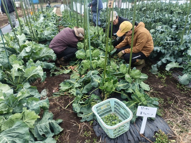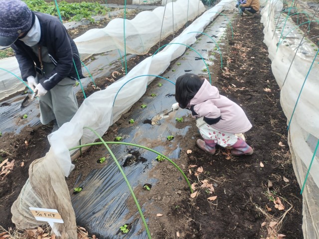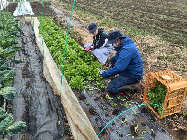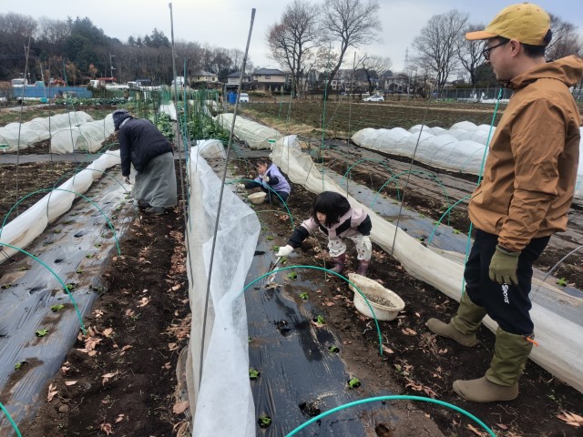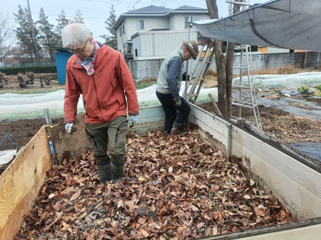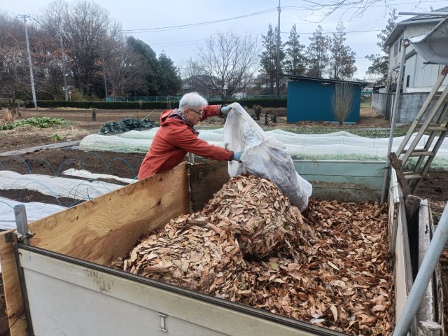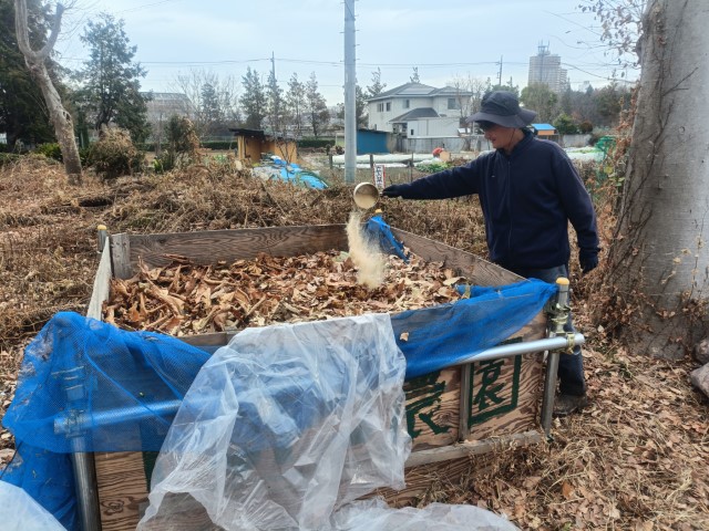 落ち葉に米ぬかと水をまいた後、踏み込んで落ち葉たい肥を作成します