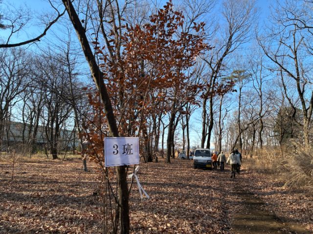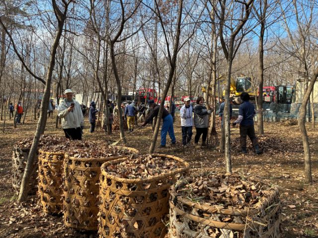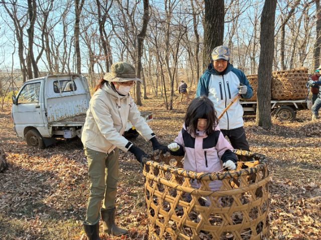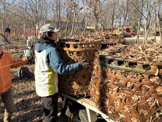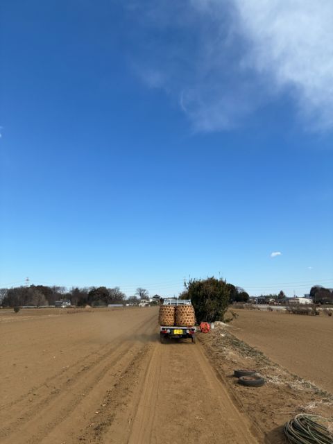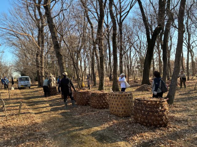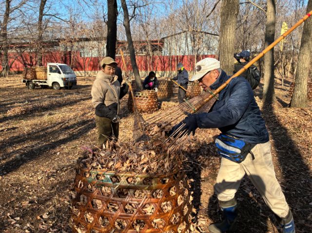 最後のかごを載せた軽トラが出発して、落ち葉かき作業、無事終了~。