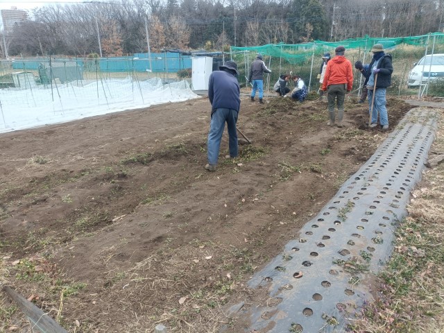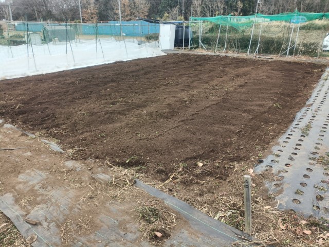 ジャガイモ用に牛ふんと落ち葉堆肥を入れて耕耘