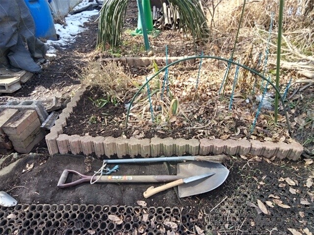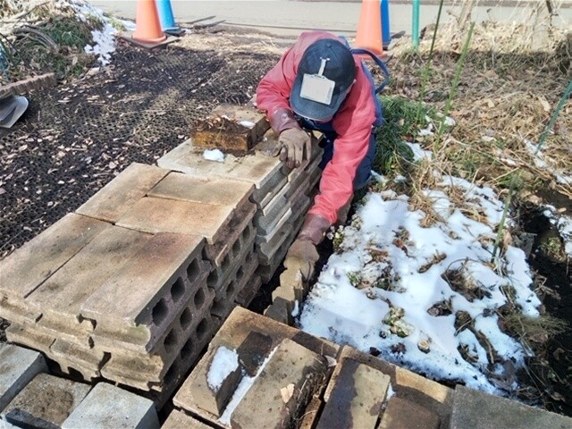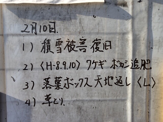 土日に雪が降った痕跡が少々残る中で作業となりました。大きな雪害はなかったことに感謝。