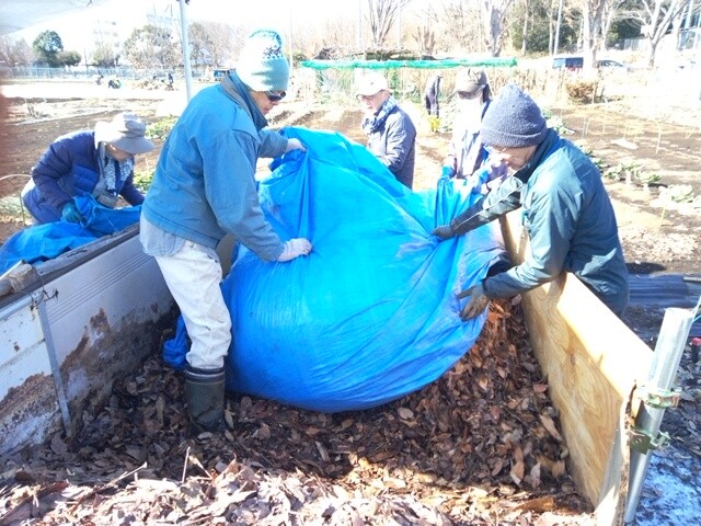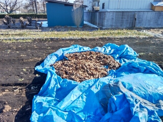 そして、空っぽになった左半分に最初に掻き出した右側上部の落ち葉をブルーシートに載せたまま入れます。それから、右側下部の落ち葉を投入します。そして、ならします。