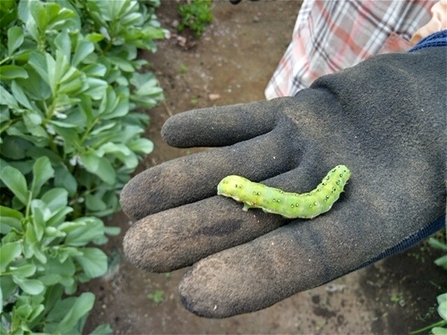 ソラマメにはアブラムシはいませんでしたが、代わりに大きな体をした幼虫がいました。グーグルレンズで調べたところ、「アヤモクメキリガ」の幼虫に似ているようでした。どなたか詳しい方がいらしたら、ぜひ教えてください。