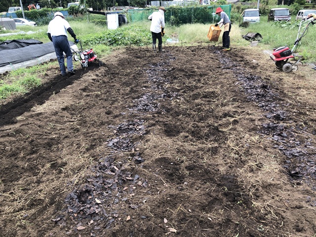 耕耘機こまめ1号を操るのがH沼さん、こまめ2号も出動準備中です。2台あると耕耘も早いです。その後畝立てを行いました