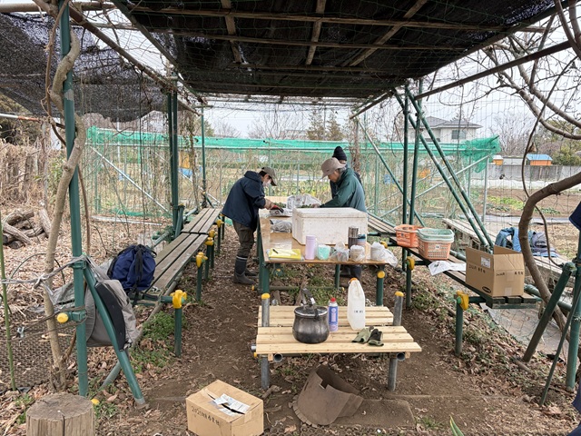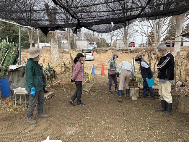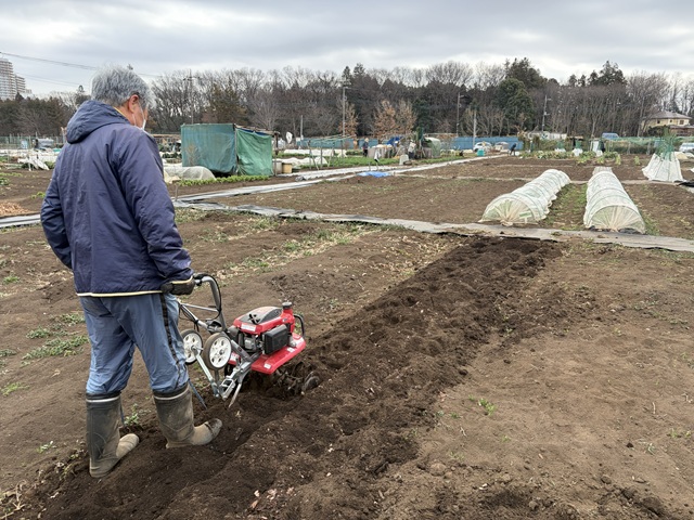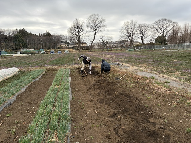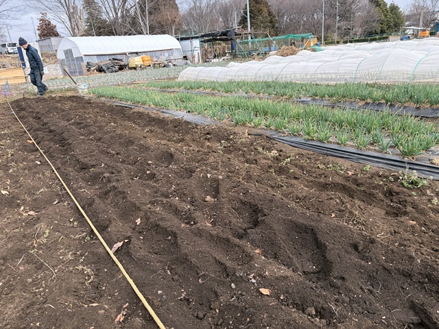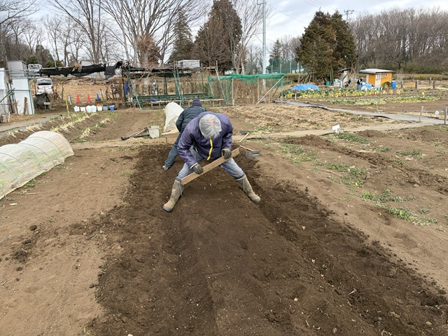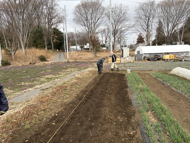 2.ミズナ、ホウレンソウ用の畝立てをしました。ミズナ用の畝に落葉堆肥、牛糞鶏糞の元肥を入れて耕耘します