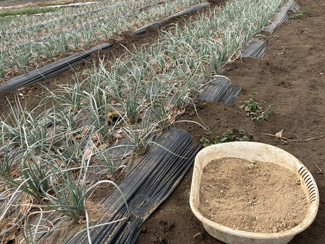 3.ラッキョウ、ニンニクにボカシ追肥をしました